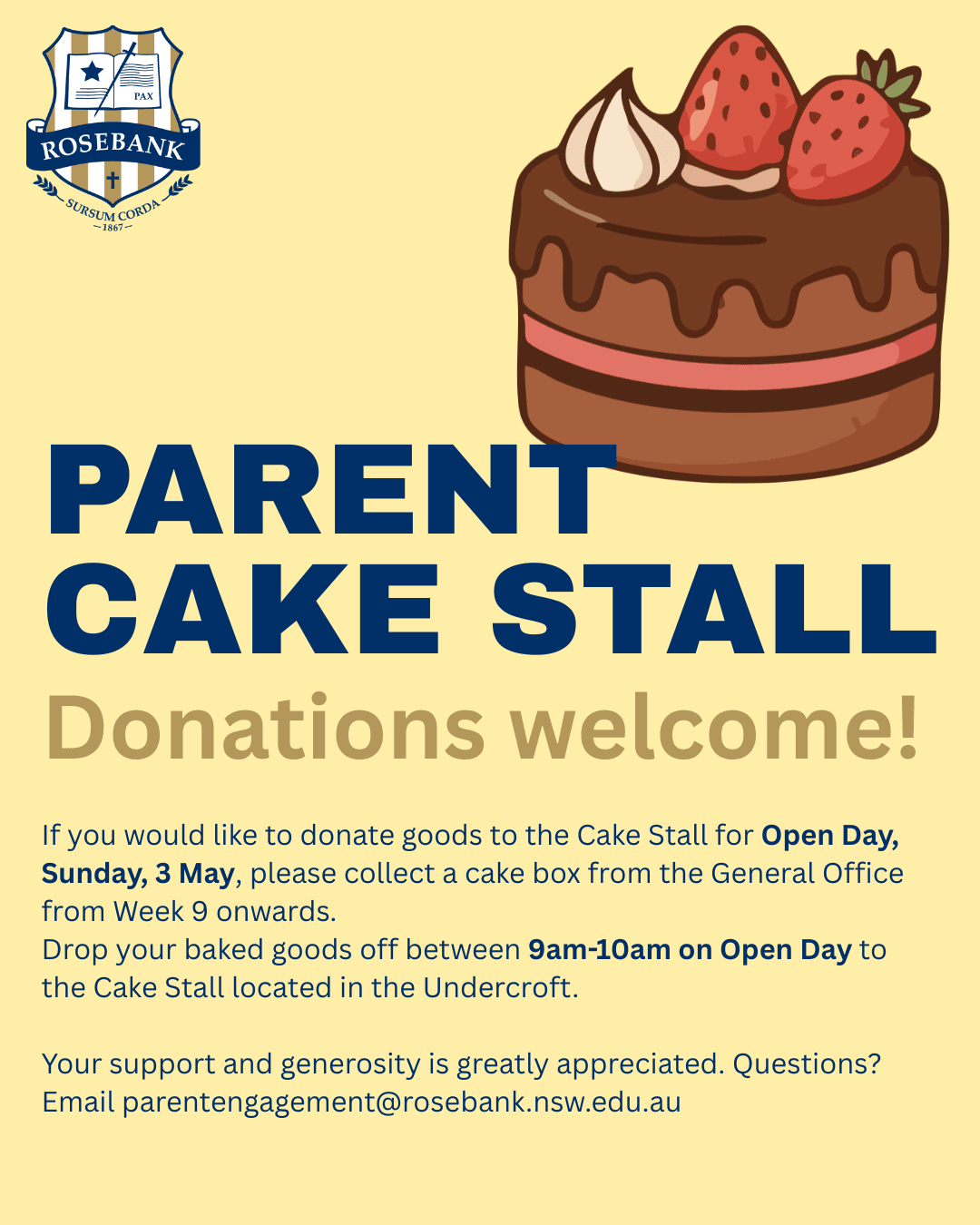 - Contact the Communications and Engagement team directly for any additional information: events@rosebank.nsw.edu.au.